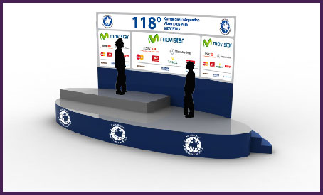 Diseño innovador del podio para el Campeonato Argentino Abierto de Polo. La propuesta incluyó una tarima de forma oval con backdrop curvo en la parte posterior. |